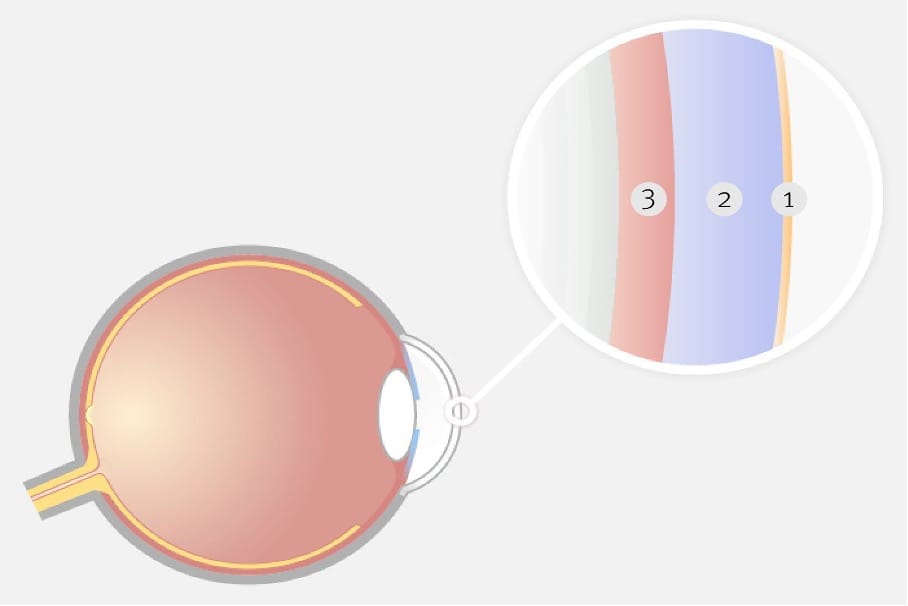 Rechts neben der grafischen Darstellung des Auges sehen Sie einen vergrößerten Querschnitt des Tränenfilms mit seinen drei Schichten – von außen nach innen: [1] Lipidschicht, [2] wässrige Schicht, [3] Schleimschicht, links davon ist die Hornhaut des Auges (grau).